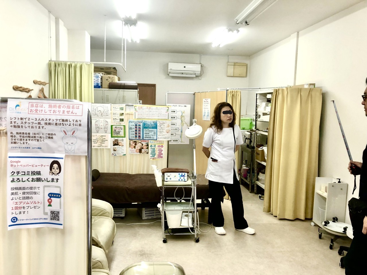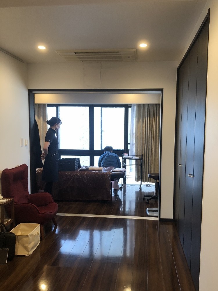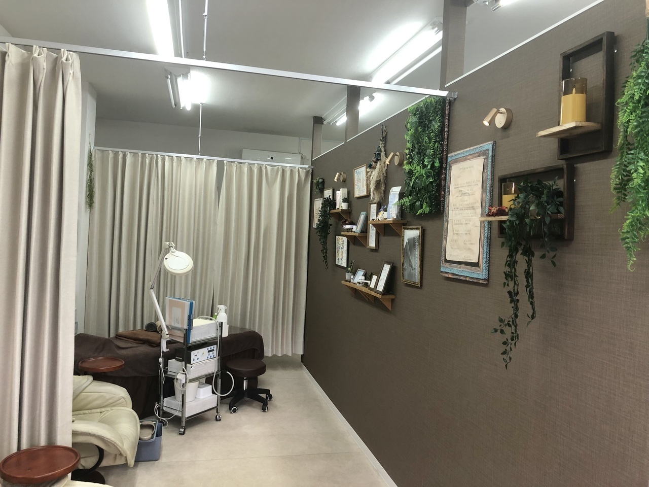 間仕切り壁を立てて壁紙は、落ち着いたブラウンにした後、カーテンレールで個室感覚を出し、治療院からサロン風に変更。
