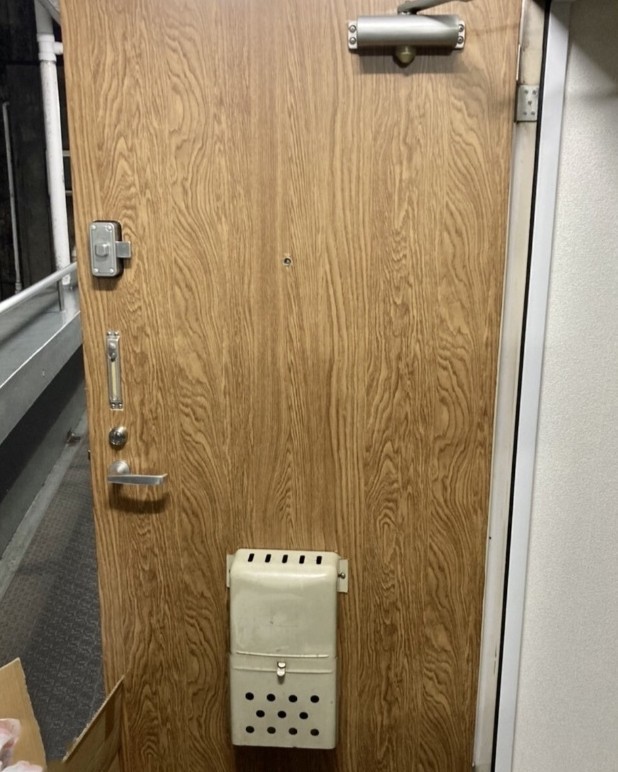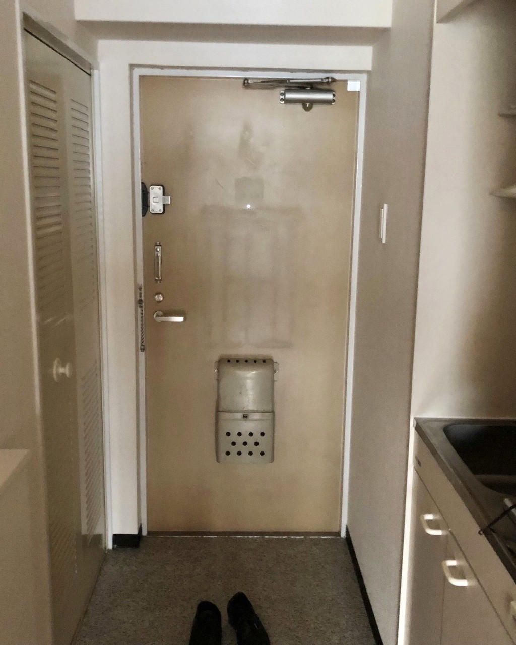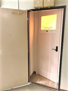 鉄の扉を開けっ放しにして、内側に木製ドアを設置しました。これで雰囲気がだいぶ変わりました。