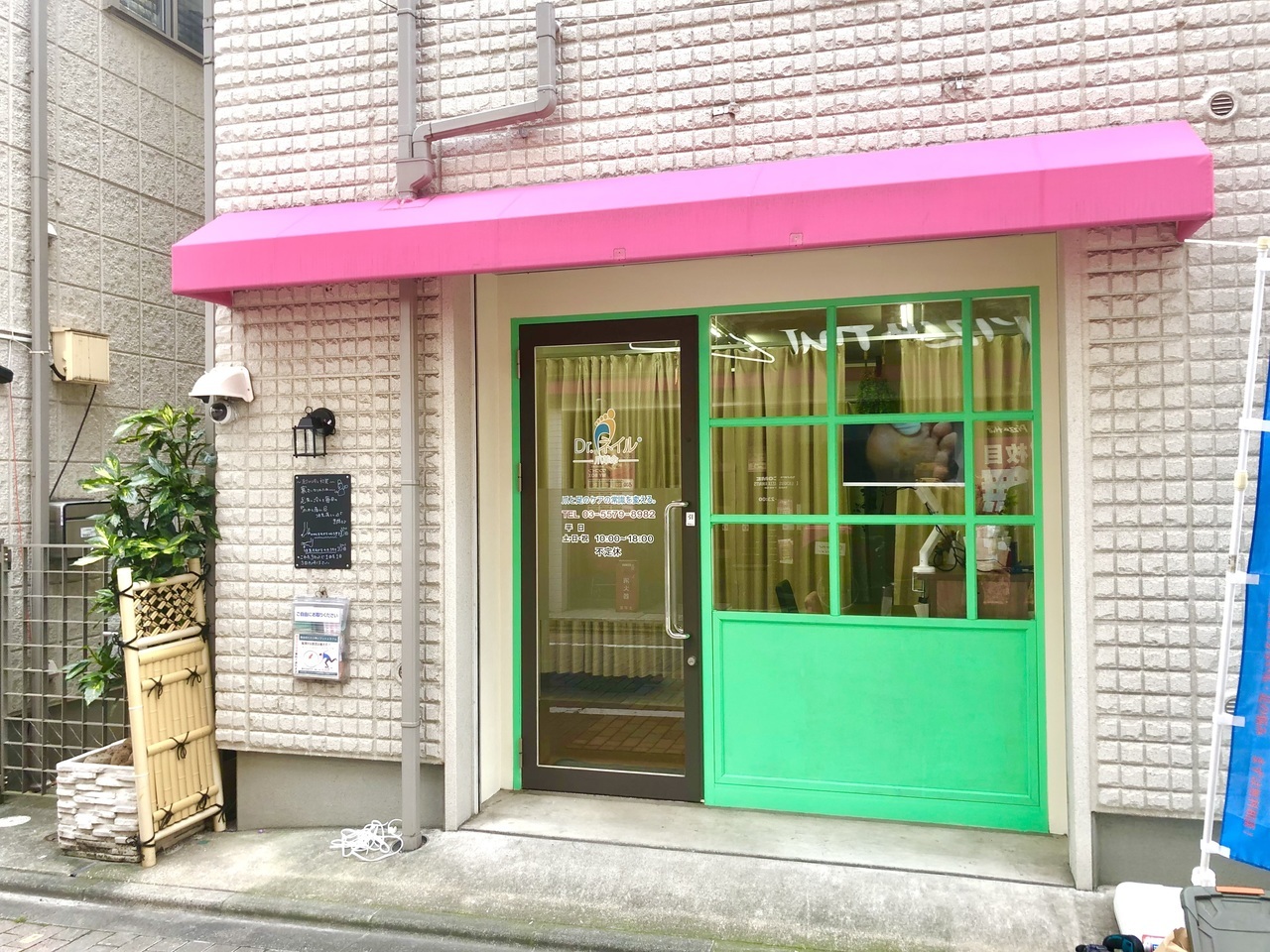 看板撤去・テント清掃・カッティングシート撤去・窓枠追加・サッシ塗装・壁面左に照明とPOP板を取付。