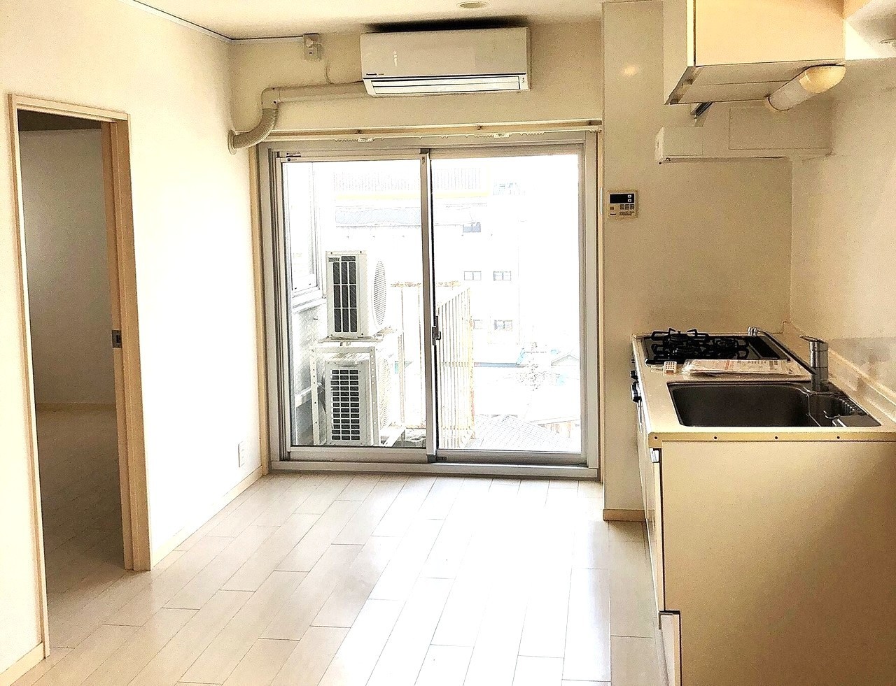 アイボリーの間仕切り壁を設置し、カーテンレールを付けてキッチンを完全に隠しました
