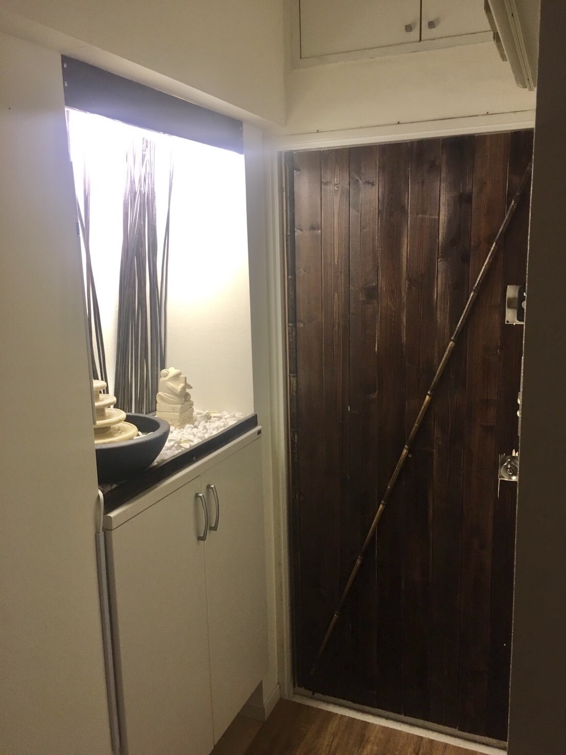 鉄の扉の内側の面に板を貼り、マンションの玄関をバリ風にしました。